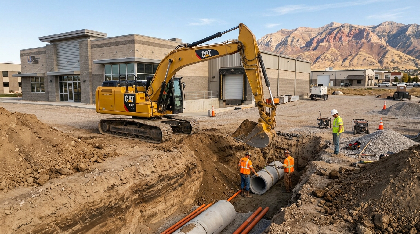 Commercial sewer mains, parking lot drainage, utility tie-ins for property managers.