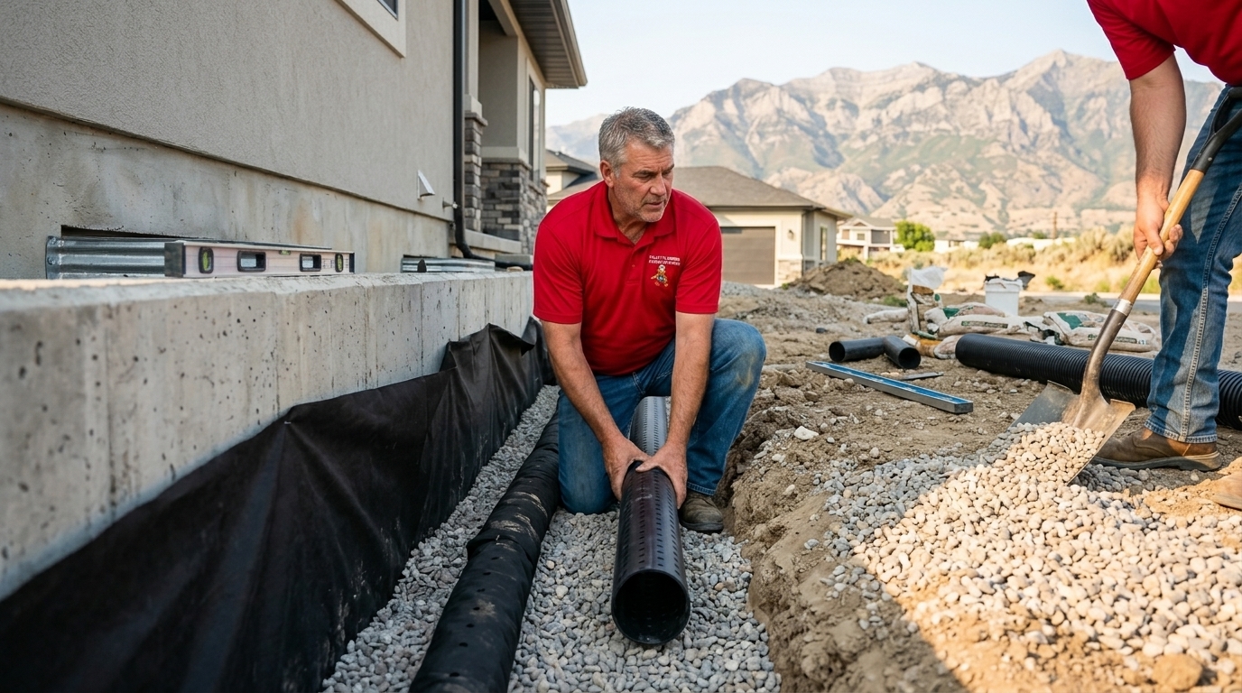 Perimeter foundation drains, yard drainage, downspout tie-ins to prevent basement water.