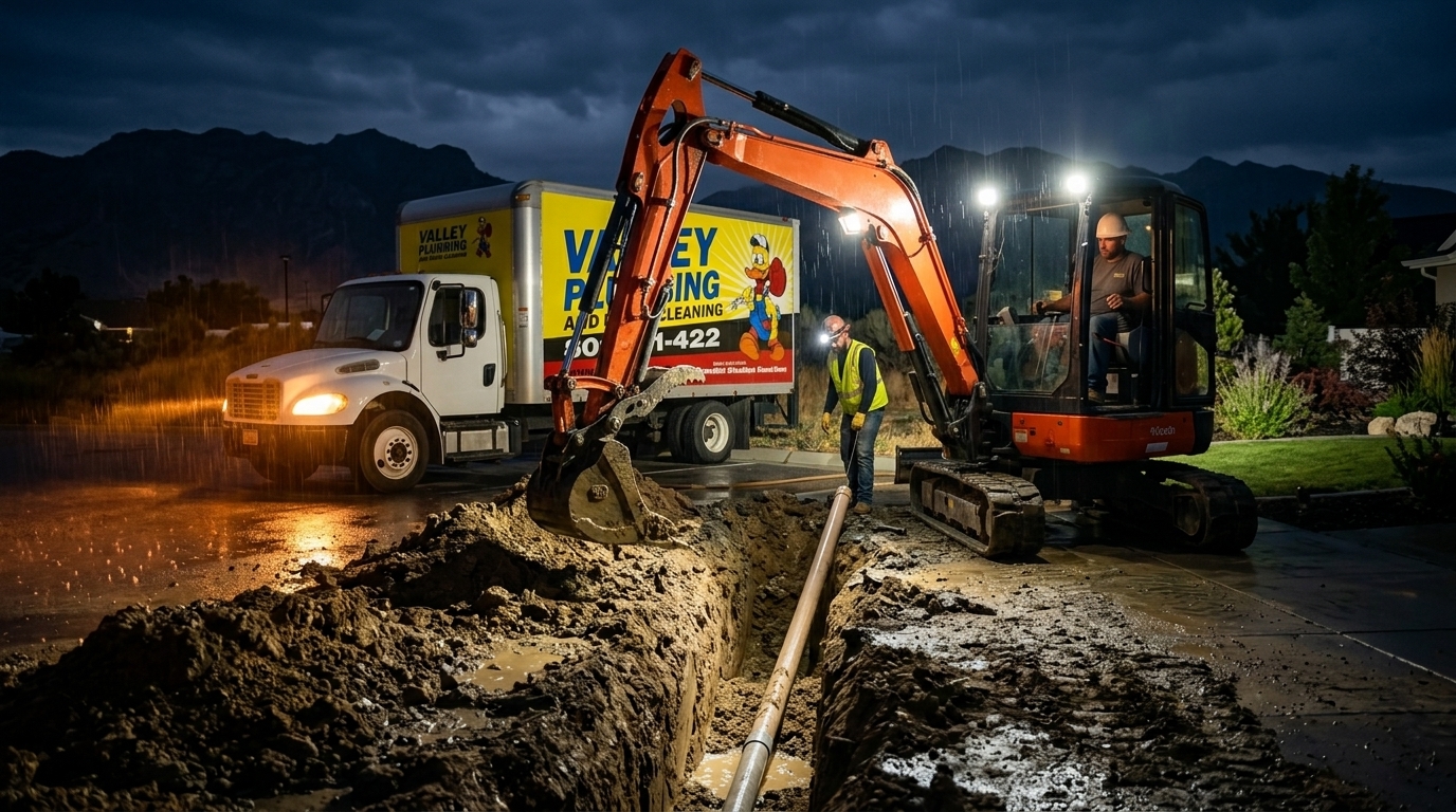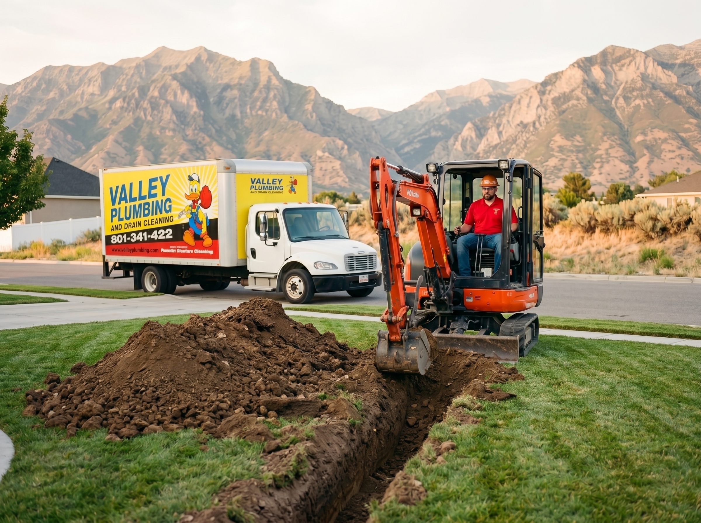 Most plumbing companies pick up the phone for sewer line or main water line jobs and call a subcontractor. Valley doesn't. We run our own excavation crews — mini-excavators, full-size excavators, vacuum trucks, pipe bursters, utility locators — in-house. When you call about a broken main line, the same crew on the phone is the crew doing the work.