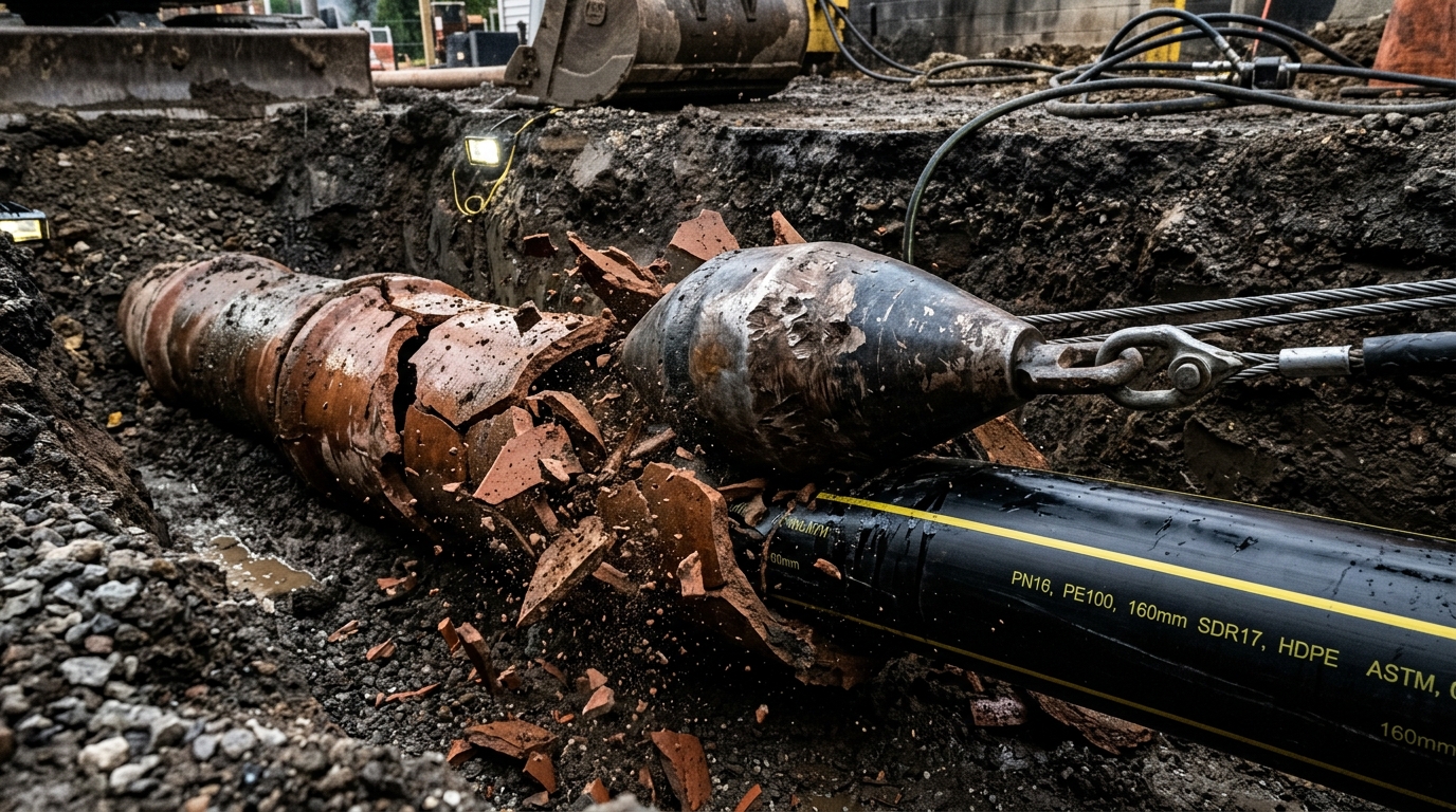 Broken, leaking, or corroded main — PEX, copper, or HDPE replacement with permit.